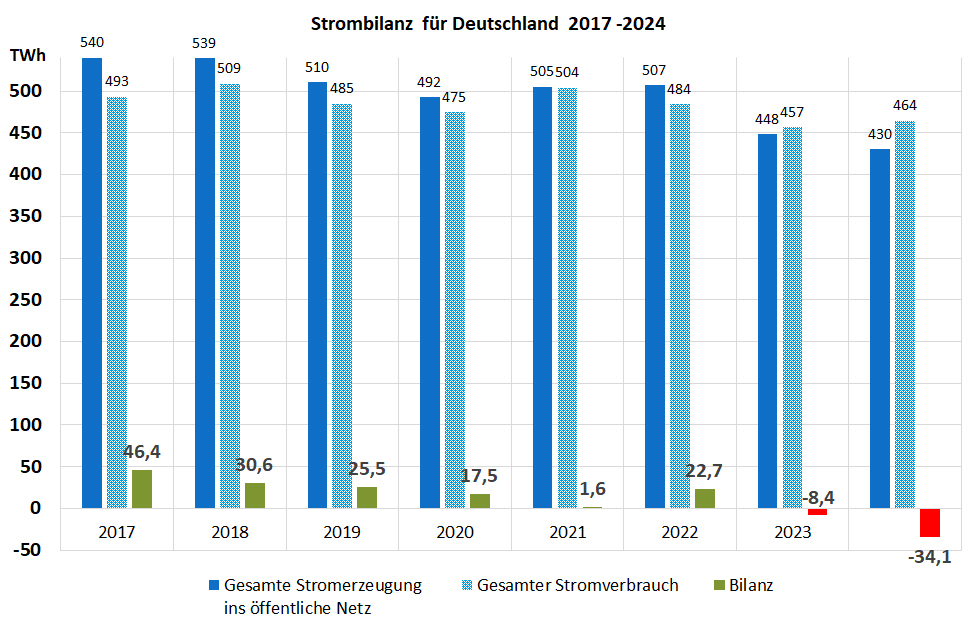 Die gesamte produzierte und ins Netz eingespeiste Strommenge in Deutschland betrug 430 TWh und die verbrauchte Strommenge betrug 464 TWh. Das bedeutet, dass Deutschland im Jahre 2024 in der Summe eine Strommenge von ca. 34 TWh aus anderen Ländern importiert hat.