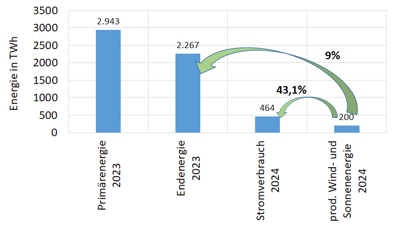 In Deutschland betrug der Anteil der Wind- und Sonnenenergie [1] im Jahre 2024 bezogen auf die Endenergie 2023 [2] gerade mal 9%.