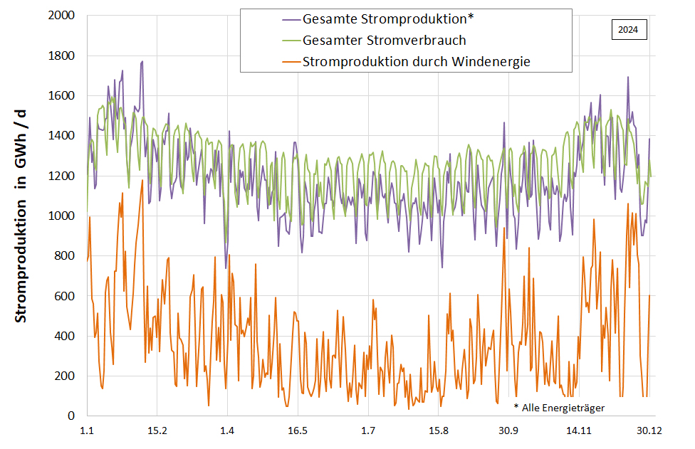 Die folgende Grafik zeigt die Tagessummenwerte des gesamten in Deutschland produzierten und verbrauchten Stromes im Jahresverlauf 2024 sowie die Tagessummenwerte des produzierten Stromes aus Wind- und Sonnenenergie. Dabei fallen die regelmäßigen Amplituden im Verlauf des Gesamtstromverbrauchs von ca. 400 GWh / Tag auf. Diese regelmäßigen „Ausreißer“ nach unten sind auf die Wochenenden zurückzuführen, an denen die Industrieproduktion reduziert wird und damit der Strombedarf sinkt. Am Ostersonntag, der 31.03.2024 war der Stromverbrauch in 2024 mit 864 GWh/d am geringsten.