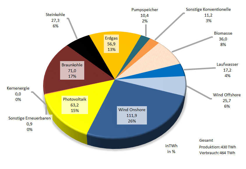 Am produzierten Strom, der ins öffentliche Stromnetz eingespeist wurde, haben die Wind- und Sonnenenergie mit 200,1 TWh zusammen einen Anteil von 46%. Nimmt man die weiteren erneuerbaren Energieträger Biomasse (36,0 TWh), Wasserkraft (17,1 TWh), Pumpspeicher (11,2 TWh) und sonstige Erneuerbaren (0,9 TWh) hinzu, dann ergibt sich ein Anteil von 61% an erneuerbaren Energieträgern an der Gesamtstromerzeugung in Deutschland. Die Stromerzeugung aus Braunkohle (71,0 TWh) und Steinkohle (27,3 TWh) ergab einen Anteil von 22,8 % an der Gesamtstromerzeugung in Deutschland. Die Ära des Stroms aus Kernenergie, endete am 15.4.2023.