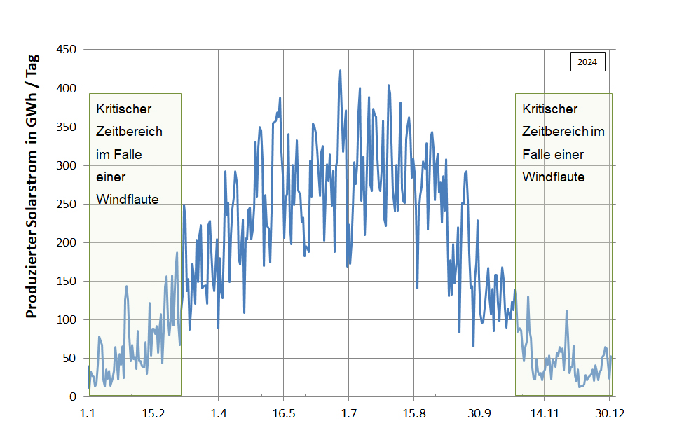 Der Zeitraum in den Herbst- und Wintermonaten, also zwischen Mitte Oktober und Mitte März ist ein besonders kritischer Zeitbereich, denn im Falle einer Windflaute kann die dann ausbleibende Strommenge der Windenergie, nicht durch die produzierte Strommenge aus der Sonnenenergie ausgeglichen werden. Das bedeutet, dass es dann, bei einer ausschließlich auf Sonnen- und Windenergie ausgerichteten Energiewirtschaft, zu Versorgungslücken kommen wird.