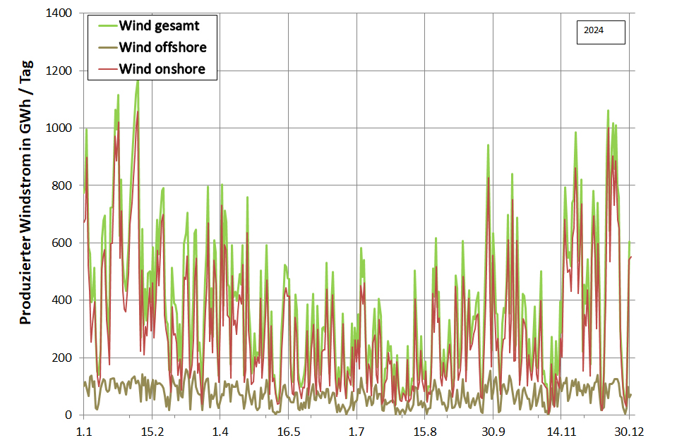 Die folgende Grafik zeigt die Tagessummenwerte des produzierten Windstromes im Jahresverlauf 2024 für ganz Deutschland [1]. Dieser Windstrom wurde aus 28717 Windenergieanlagen (WEA) an Land[5] und 1639 WEA offshore[6] erzeugt. Es ist augenscheinlich, dass in den Herbst, Winter und Frühjahrsmonaten die produzierte Strommenge durch Windenergie höher ist als in den Sommermonaten. Damit kann die Windenergie prinzipiell die Defizite der Solarenergie in den Wintermonaten ausgleichen. Leider gibt es auch in diesem „Winter-Zeitraum“ tagelange Perioden mit einer Flaute und mit geringer Windenergie, wodurch es zu Engpässen kommen kann. Desweiteren sind die geringen Windenergiemengen in den Sommermonaten kritisch zu werten. Zwar wird sich in der Tagessumme ein erhöhter solarer Stromertrag ergeben, der die geringen Windmengen ausgleichen kann, in der Nacht fällt der Solarstrom aber auf Null ab, wodurch es zu einer Versorgungslücke kommen kann.
