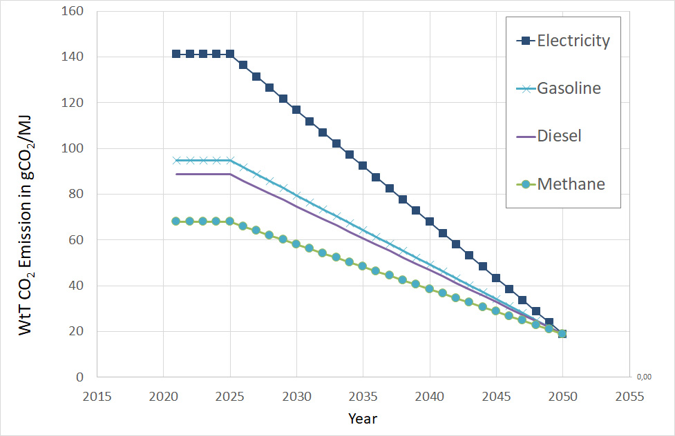 Ein solcher CO2-Footprint eines Energieträgers könnte zum Beispiel in einer neueren Version der deutschen 38.BimschV (Bundes Immissions Schutz Verordnung) oder der europäischen Fuel Quality Directive, kurz FQD, entsprechend Abbildung 3, vorgeschrieben werden.